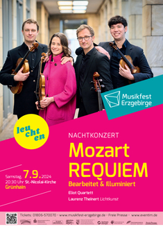 Die Besucher erwartet in diesem Jahr ein ganz außergewöhnliches Musikerlebnis. Beim Nachtkonzert am 7. September 2024, 20.30 Uhr in der Kirche St. Nicolai-Kirche Grünhain werden das Eliot Quartett und der Lichtkünstler Laurenz Theinert Mozarts Requiem in besonderem Licht erstrahlen lassen. Tickets sind u. a. unter: 01806 570070 • www.musikfest-erzgebirge.de • Freie Presse • www.eventim.de erhältlich.