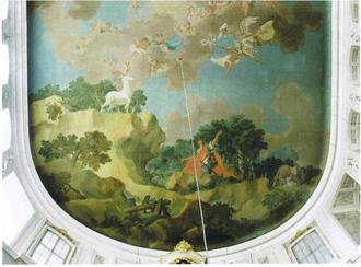 Das Deckengemälde in der Kapelle vom Schloss Hubertusburg stellt die Hubertuslegende dar (von Johann Baptist Grone).