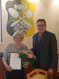 Bürgermeister Mirko Geißler überreicht Stadträtin Maria Eisentraut die Ernennungsurkunde.