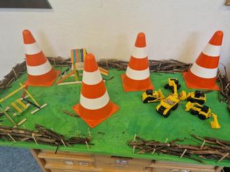 Bagger und Verkehrshütchen gehören auch zum Baugeschehen in der Kita.