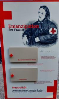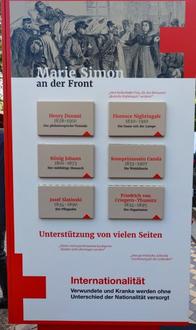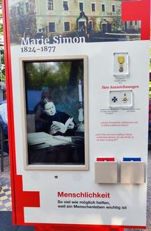 Auch das diesjährige Sommerfest des DRK-Landesverbandes Sachsen, an dem zwei Mitglieder der Museumsgruppe teilnahmen, stand unter dem Zeichen der vergessenen Krankenpflegerin Marie Simon. Es fand im Carola-Schlösschen im Großen Garten in Dresden statt. Der Präsident des DRK-Landesverbandes Sachsen, Herr Peter S. Kaul, würdigte ihre Verdienste. Bei dieser Gelegenheit wurde eine Info-Säule, die mit Unterstützung unseres Museums entstanden ist, präsentiert. Auf der ersten Seite sind ihre Lebensdaten, eine Auswahl ihrer Auszeichnungen sowie ein Kurzfilm zu sehen, auf der zweiten Seite geht es um Marie Simon an der Front sowie sechs Weggefährten aus dieser Zeit. Auf Seite Drei wird über die Emanzipation der Frau und die Neutralität berichtet. Über den Albertverein und die Loschwitzer Heilstätte, die sie 1872 für Rekonvaleszenten von 1870/71 einrichtete, informiert die vierte Seite. Die Säule ist eine gelungene Bereicherung für zukünftige Veranstaltungen des DRK.