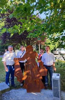 Das am 24. August eingeweihte Denkmal für Marie Simon mit einer Steele aus einheimischen Granit mit einer Gedenkplatte und einem QR-Code v.l. Mario Uebe, Mirko Gutschick, Ursula Hörig und Museumsleiter André Uebe.