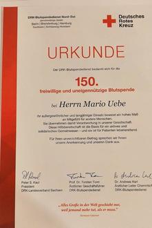 Während einer Festveranstaltung am 17. August in der Neuen Welt in Zwickau wurde unser Kamerad Mario Uebe für seine 150. Blutspende ausgezeichnet. Für ihn ist es eine Auszeichnung im doppelten Sinne. Er ist nicht nur aktiver Blutspender sondern auch Organisator der Blutspendetermine unseres Ortsvereins in Beierfeld, Grünhain und bei den Stadtwerken in Schwarzenberg. Seit Beginn unserer Blutspendeaktivitäten konnten wir über 40.000 abgenommene Konserven verbuchen. Ein herzliches Dankeschön von Seiten des Vorstandes.