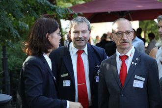 Kameraden Mario und André Uebe im Gespräch mit der Vorsitzenden des DRK-Landesverbandes Sachsen e.V., Frau Dr. Porzig.