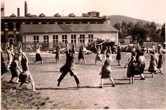 Pausenturnen der Werktätigen des VEB Messgerätewerk Beierfeld auf dem Schulturnplatz.