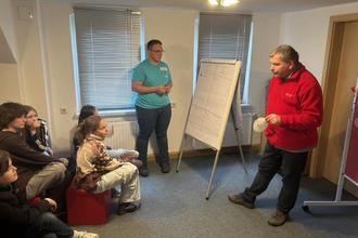 Kamerad Marion Uebe überprüft das Wissen der Ersten Hilfe bei einem Spiel.