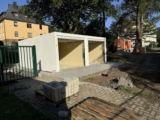 Unsere neuen Garagen wurden mit einem riesigen Kran gebracht. Im Bereich davor wurde schön gepflastert, so dass unsere Kinder sicher mit den Fahrzeugen aus- und einparken können.