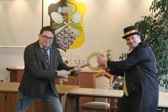 Bürgermeister Mirko Geißler und Chris Rößner (v. l.) im Kampf um den Rathausschlüssel.