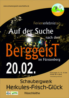 Am 20. Februar 2025 sind alle Ferienkinder nach Waschleithe eingeladen. Gemeinsam soll der Berggeist gesucht werden, welcher tief im Inneren des Fürstenberges sein zuhause hat. Dass dies nicht einfach wird, werden die Kinder schnell merken. Sind doch die Stollengänge eng, dunkel und lang. Doch mit Unterstützung des Bergführers wird es sicher gelingen, den Berggeist zu Gesicht zu bekommen.