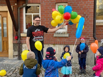 Zur Faschingsparty im Turnraum der Kita gab es ordentlich was zum Lachen: Der Clown und sein Freund der Schmetterling führten für die Kinder eine lustige Show mit dem Floh Fiepsie vor. Der kleine Floh zeigte atemberaubende Kunststücke, die nur bei ganz genauem Hinsehen zu erkennen waren.