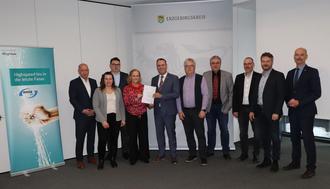 Bescheidübergabe zum Start des Breitbandprojektes im Erzgebirgskreis am 06.03.2023. Beteiligte Kommunen Cluster 5 (v. l. n. r.): Geschäftsführers Stephan Drescher, Dana Korb (Hauptamtsleiterin Gemeinde Raschau-Markersbach), Mirko Geißler (Bürgermeister Stadt Grünhain-Beierfeld), Staatssekretärin Ines Fröhlich, Landrat Rico Anton, Jörg Hartmann (Bürgermeister Stadt Elterlein), Ruben Gehart (Oberbürgermeister Große Kreisstadt Schwarzenberg), Lars Dsaak (Bürgermeister Gemeinde Breitenbrunn/Erzgeb.), Thomas Kunzmann (Bürgermeister Stadt Lauter-Bernsbach) und Michael Staib (Bürgermeister Stadt Scheibenberg).