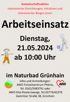 Am Dienstag, den 21.05.2024 gibt es die Möglichkeit, sich in seiner Kommune zu engagieren und vor Ort etwas zu bewirken. Unter Federführung des AWO-Ortsvereins Grünhain, der Kita Klosterzwerge und des Freizeitzentrums Phönix sowie in Kooperation mit der Stadt Grünhain-Beierfeld findet von 10 – 18 Uhr ein Badputz in Grünhain statt.