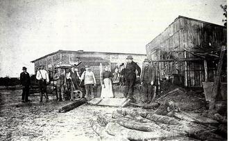 Bahnbauarbeiter. Die Schuppen dienten zur Aufbewahrung der Gerätschaften und Materialien, auch waren eine beachtliche Anzahl von Kantinen entlang der Bahnstrecke vorhanden. Foto: Sammlung Siebenhühner