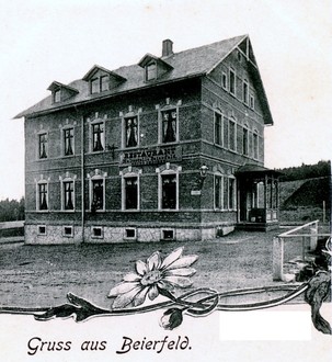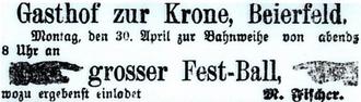 Nach reichlich drei Jahren Bauzeit wurde am 30. April 1900 die Bahnlinie Zwönitz - Scheibenberg und die Haltestelle Beierfeld eröffnet. Über den Verlauf der hierbei veranstalteten Festlichkeiten berichtete das Amtsblatt „Erzgebirgischer Volksfreund“ am 2. Mai 1900 wie folgt: