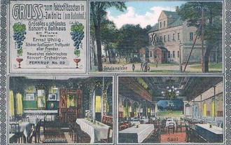 Um 2 Uhr langte der Zug wieder in Zwönitz an, woselbst sich die Festtheilnehmer von Musik empfangen und unter Vorantritt der Zwönitzer Stadtkapelle nach dem nahe dem Bahnhof gelegenen „Feldschlösschen“ begaben, dessen Saal als der größte in weiter Umgebung, von dem das Festdiner ausführenden Herrn Hotelier Tauchmann (Hotel blauer Engel, Zwönitz) gemiethet worden war.