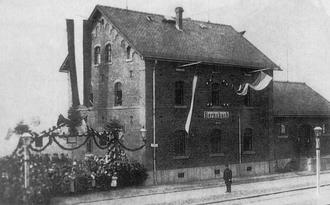 Das Empfangsgebäude in Bernsbach in roter Ziegelbauweise zur Bahnweihe am 30. April 1900.