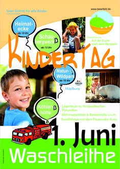 Am 1. Juni wird in Waschleithe wieder Kindertag gefeiert. Auf die Kleinen warten verschiedenste Angebote. In der Schauanlage Heimatecke haben alle Kinder an diesem Tag freien Eintritt und im Schaubergwerk „Herkules-Frisch-Glück“ werden ab 13 Uhr Erlebnisführungen angeboten. Gleich nebenan an der Köhlerhütte Fürstenbrunn gibt es u.a. einen tollen Aktionsspielplatz und Rundfahrten mit der Feuerwehr.