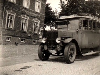 Der erste Bus der Kraftpost vom Typ Büssing an der Haltestelle Bahn-Hofsrestaurant 1926.