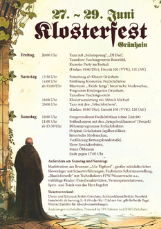 Unser Grünhainer Klosterfest rückt nun in greifbare Nähe, die Vorbereitungen laufen auf Hochtouren und das Fieber steigt bei allen Beteiligten und Machern. Hier das aktualisierte Programm was unsere hoffentlich zahlreichen Gäste erwartet: