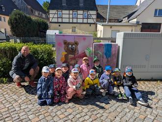 Gemeinsam mit Nico Roth erlebten unsere Vorschüler Anfang Mai einen kreativen Tag. Unsere Kinder konnten sich im Vorfeld ein schönes Motiv aussuchen. Und welches war naheliegender als unser Bärchen mit einer Zuckertüte. Am 09. Mai 2025 traf sich die Gruppe am kleinen Teich in Grünhain und sprayten unter Anleitung ihr Bärchen. Auf dem Rückweg zur Kita durften sich die Kinder Pizza zum Mittag mitbringen. Ein rundum gelungener Tag. Vielen Dank an Nico und dem Kooperationsprojekt von envia M.