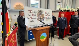Die Kameraden der Freiwilligen Feuerwehr Grünhain übergaben an Ortswehrleiter Thomas Schramm (2.v.r.) ein Erinnerungsgeschenk.