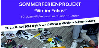 | Mo | 08.07. | Offenes Angebot Kommt vorbei zum Spielen, Basteln, Ideen sammeln und Quatschen! | 12.00 Uhr bis 18.00 Uhr Schulclub Schwarzenberg | - keine Anmeldung erforderlich - Taschengeld für Verpflegung |