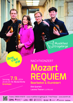 Am 30. August 2024 startet der 8. Jahrgang des Musikfestes Erzgebirge. Unter dem Jahresmotto „LEUCHTEN“ finden insgesamt 16 Konzerte und Veranstaltungen in den Bergstädten der Region statt. Beim Nachtkonzert in der Kirche Grünhain werden das Eliot Quartett und der Lichtkünstler Laurenz Theinert Mozarts Requiem in besonderem Licht erstrahlen lassen. Der Ticketverkauf hat begonnen.