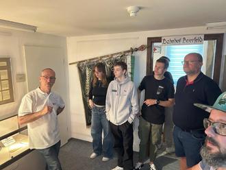 Angehende DRK-Notfallsanitäter lauschen dem Museumsleiter André Uebe bei seinen Ausführungen zur Rot-Kreuz-Geschichte.