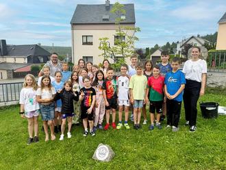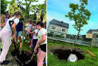 Mit einer gemeinsamen Pflanzaktion verabschiedeten sich die Mädchen und Jungen der Klasse 4b von ihrer Grundschule. Kurz vor Ferienbeginn wurde mit Spaten und Schaufel eine Kastanie in die Erde gebracht. Der neu gepflanzte Baum hat seinen Standort im Schulhof, direkt vor dem Schulgebäude. Bis er eine stattliche Größe hat und Früchte trägt, werden einige Jahre vergehen. Wie beim Baum, so liegen auch vor den Kindern noch viele Jahre. Nach ihrer Grundschulzeit werden sie ab August an weiterführenden Schulen auf das Leben vorbereitet. Auch wenn sich ihre Wege trennen, so werden sie mit ihrem selbstgepflanzten Baum stets an die gemeinsame Schulzeit in Grünhain erinnert.