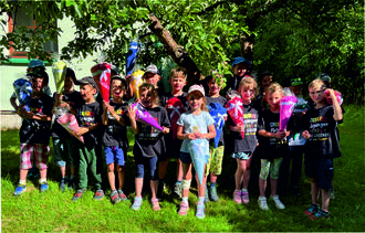 Unterwegs warteten einige Stationen auf die Kinder. Hier gab es zum einen einen inszenierten Unfall, bei dem die Kinder als Ersthelfer agierten. Ein Stück weiter folgte eine Sportstation. Hier gab es nach dem Sport auch eine leckere Abkühlung. Über Feld und durch den Wald erreichten wir die nächste Station. Mit Schlumpf-, Feen-, und Erziwasser überbrückten wir das Warten auf unser nächstes Highlight. Die Feuerwehr überraschte die Kinder mit Blaulicht und Sirene, sowie der Fahrt bis zur Landpension. Dort angekommen durften die Kinder ihre Übernachtungsmöglichkeit beziehen und sich danach mit Pizza stärken.