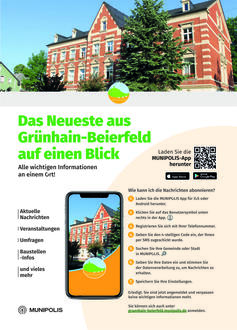 Seit September 2025 hat die Stadt Grünhain-Beierfeld ein neues Kommunikationssystem für alle Bürger. Die Munipolis-App ermöglicht es, wichtige Informationen und Neuigkeiten aus dem Stadtgeschehen direkt auf das Handy oder online zu empfangen. Dieser Dienst wird kostenlos zur Verfügung gestellt.