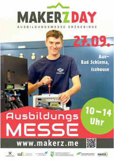 An insgesamt vier Standorten finden im Herbst 2025 die Ausbildungsmessen Erzgebirge statt. In Aue-Bad Schlema wird am Samstag, den 27.09.2025 zum MAKERERZ DAY eingeladen. Von 10 – 14 Uhr können Jugendliche im Icehouse Aue Berufe erleben, Ausbildungsmöglichkeiten finden und Kontakte knüpfen.