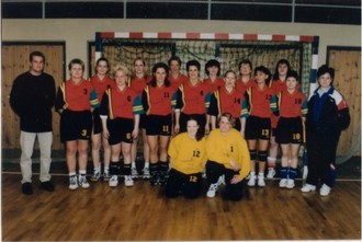 Handball-Damen des SV Beierfeld für die Saison 1999/2000. Reihe hinten v. l. n. r.: Sponsor Herr Kraßhoff, K. Pierer, Köhler, A. Kutsch- bauch, P. Staffa, K. Mehlhorn, Straßhoff. Reihe mitte v. l. n. r.: K. van Bernum, M. Schmuck, K. Vetter, I. Morbach, S. Kästner, M. Fugmann, S. Mehlhorn, Trainerin Fichtner. Torfrauen: S. Müller, K. Schrader.