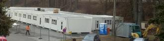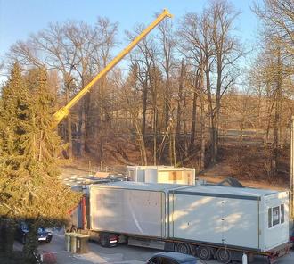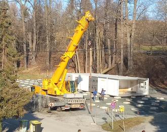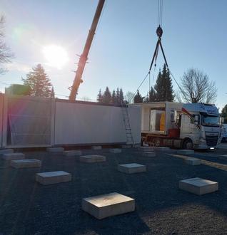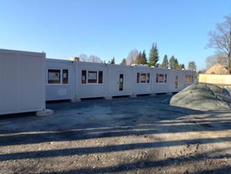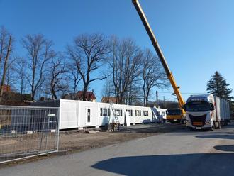 Offizieller Baubeginn soll im Mai 2025 sein. Die Baumaßnahme selbst inklusive der Freianlagen soll Anfang Dezember 2026 abgeschlossen sein. Wir werden regelmäßig zu geeigneten Zeitpunkten darüber informieren. Anbei finden Sie Bilder von der Lieferung und dem Aufbau der Containeranlage.