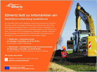 Der Übertragungsnetzbetreiber 50Hertz startet mit dem Bau der Gleichstromverbindung SuedOstLink. In diesem Sommer sollen im Abschnitt A2, der durch Saalekreis und Burgenlandkreis führt, einige dem Planfeststellungsbeschluss vorgezogene Baumaßnahmen realisiert werden. Welche Maßnahmen wo genau umgesetzt werden, darüber informiert 50Hertz mit zwei Infomärkten Anfang Juni.