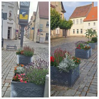 Als ich neulich Frau Erika Stöbe beim Gießen der Blumen am Parkeingang traf, kam ich mit ihr ins Gespräch. Ich wusste, dass sie in privater Initiative den Parkeingang bepflanzt und pflegt. Im Gespräch erzählte sie mir, dass sie auch die Kübel rund um den Marktplatz bepflanzt und pflegt. Das war mir neu. Im Rathaus haben wir immer gerätselt, wer Kübel auf dem Marktplatz so farbenfroh gestaltet.