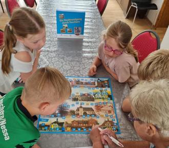 Die Hortkinder besuchten die Bibliothek Teuchern, wo sie nicht nur durch die Bücherregale stöbern durften, sondern auch das neue, selbst entwickelte Spiel „Stadtrundgang in Teuchern“ ausprobieren konnten. Das Spiel gab den Kindern spielerisch einen kleinen Einblick in die Geschichte und in die Gegenwart ihrer Heimat. Auch der neue Spielwagen mit Outdoorspielen bereitete den Schlaufüchsen viel Spaß. Danke für den tollen Tag.
