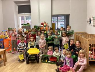Die Kinderaugen leuchteten, als am 29.11.2025 zum Krössulner Weihnachtsmarkt plötzlich ein Tieflader mit Geschenken die Straße entlangfuhr. Spielzeug-Traktoren, Bobby-Cars, Kekse, Puzzles und noch vieles mehr waren liebevoll in riesige Geschenke verpackt. Der Weihnachtsmann persönlich forderte die Kinder auf, die Pakete zu öffnen. Die Freude und das Staunen bei Kindern, Erziehern und Zuschauern war riesig. Die Autos und Traktoren wurden an Ort und Stelle bestaunt und ausprobiert. Im Anschluss wurden alle Geschenke vom Tieflader bis in die Villa Regenbogen nach Krauschwitz geliefert.