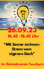 Am 26.09.2023 lädt das Klimaschutzmanagement der Stadt Teuchern von 16.45 bis 18.45 Uhr zu einer Informationsveranstaltung zum Thema Photovoltaik ein. Die Veranstaltung findet in den Räumlichkeiten des Heimatvereins statt und wird über die Volkshochschule Burgenlandkreis online durchgeführt. Unter dem Titel „Mit Sonne rechnen – Strom vom eigenen Dach“, erläutert ein Energieberater der Verbraucherzentrale unter welchen Voraussetzungen private Bauherren, Hauseigentümer oder Vermieter von der Installation einer PV-Anlage profitieren. Im Mittelpunkt stehen Fragen zur Planung einer PV-Anlage und evtl. eines Stromspeichers. Anhand von Fallbeispielen bringt der Experte Licht ins Dunkel.