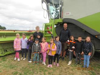 In den Ferien machten die Hortkinder zusammen mit den Sonnenkäferkindern einen Ausflug zu Familie Uherek nach Gröbitz. Herr Uherek zeigte uns seine Mais- und Getreidefelder. Er erklärte uns mit einem Messgerät den Feuchtigkeitsgehalt von Gerste, damit er genau weiß, wann das Getreide geerntet werden kann. Das Getreide muss einen Zielwert von maximal 14 % aufweisen. Wir durften das Getreide selbst in der Hand reiben, um so zu überprüfen, ob es schon zur Ernte reif ist. Anschließend pflückte sich noch jeder einen Maiskolben, den verzerrten alle Kinder mit viel Genuss und Florian Uherek teilte uns mit das es 1000 verschiedene Maissorten gäbe. Bevor es weiter nach Gröbitz zum Landwirtschaftsbetrieb ging. Große Aufregung war bei den Kindern zu spüren, als wir einen Mähdrescher von Nahen betrachteten und jeder das Vergnügen hatte einmal Probe sitzen zu dürfen. Herr Uherek erklärte alle Schaltknöpfe und Funktionen im Innenraum der Maschine. Die Kinder waren sehr interessiert und stellten viele Fragen. Die eingebrachte Ernte lagert die Familie in einer großen Halle ein, Mais, Raps und Getreide konnten wir bestaunen und anfassen. Diese Saatkörner dienen als Kraftfutter für die Tiere oder werden zu Nudeln verarbeitet. Nach einem leckeren Eis haben wir uns noch die Pferde den Hund und die roten Rinder auf dem Hof angeschaut. Einige Kinder trauten sich die Pferde zu streicheln und striegeln sowie die Hufe zu reinigen. Für alle Beteiligten war dieser Ausflug sehr informativ und wissenswert. Wir bedanken uns recht herzlich für dieses tolle Erlebnis und freuen uns schon auf den nächsten Besuch bei Familie Uherek. Mit viel neuem Wissen kehrten wir wieder in die Kita zurück.