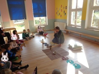 Frau Lange, die Gemeindepädagogin, erzählte uns die Ostergeschichte und alle Kinder lauschten ganz gespannt ihren Worten. Es gab auch einen Schluck Saft aus einem getöpferten Becher mit einem Kreuz, genauso wie es in der Geschichte erzählt wurde, dass Jesus seinen Wein mit seinen Freunden teilte.