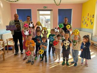 Auch Herr Mock und Herr Goetz vom Sportverein besuchten uns und kamen nicht mit leeren Händen. Sie überreichten uns viele bunte Bälle, Schokoosterhasen und andere Leckereien. Auch ein großes DANKE an den Sportverein!