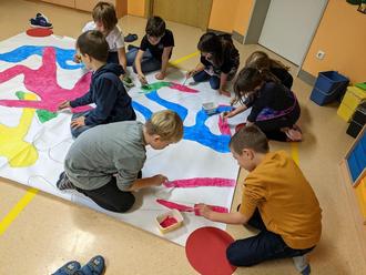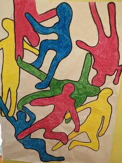 Die Kinder der Klasse 3a beschäftigen sich mit dem New Yorker Künstler Keith Haring (1958-1990), ein Straßenkünstler und sozialer Aktivist. Er begann seine Karriere mit Graffiti auf den Straßen und U-Bahnen. Im Stil des Künstlers gestalteten die Kinder ein übergroßes Plakat. Zuerst legten sie sich auf das Papier und umrandeten sich gegenseitig. Im Anschluss wurden mit viel Freude diese Figuren farbig ausgemalt. Damit die Figuren besser zur Geltung kommen, bekamen sie noch eine schwarze Umrandung. Nun ziert dieses Plakat das Klassenzimmer der 3a. Die beteiligten Kinder können stolz auf ihr Kunstwerk sein und ich bin es auch.