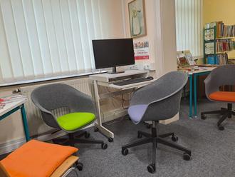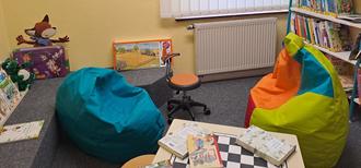 Im Frühjahr konnten wir die Renovierung und Neuausstattung des Empfangsbereiches realisieren. Jetzt haben wir mit Hilfe der Fördermittel aus dem „Kulturraum Leipziger Raum“ die Aufenthaltsqualität mit neuen Sitzgelegenheiten weiter verbessert. Es gibt gemütliche Sitzsäcke, höhenverstellbare Schalensessel an den Arbeitsplätzen und einen sogenannter „Erzieherinnenstuhl“, damit Erwachsene bequem und sicher mit den ganz Kleinen auf Augenhöhe sitzen können.
