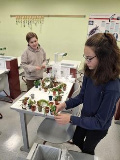 Die restlichen Pflanzen erreichten die Schule direkt aus einer Wasserpflanzengärtnerei. Dort werden die Pflanzen oberhalb des Wassers in Gewächshäusern mit hoher Luftfeuchtigkeit vermehrt. Dabei ist es wichtig zu wissen, dass viele Aquarienpflanzen sich von der Kultur über Wasser auf ein Leben unter Wasser umstellen müssen. Oft verlieren sie alte Laubblätter, bevor sie mit der Bildung von angepassten Unterwasserblättern beginnen. Bevor es an das Einpflanzen geht, muss die Steinwolle, welche die Wurzeln umgibt, entfernt werden. Mit Pinzette ausgestattet, gelingt das Einsetzen der zarten Pflänzchen leicht. Eine gute Portion Fingerspitzengefühl trägt ihr Übriges zum Gelingen bei.