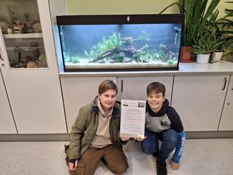Sichtlich mit Stolz erfüllt zeigen Constantin Krieger (7a) und Björn Hofmann (7a) die aufgestellten Verhaltensregeln für das neue Aquarium vor. Schließlich sollen die schreckhaften Bewohner nicht in Stress versetzt werden.