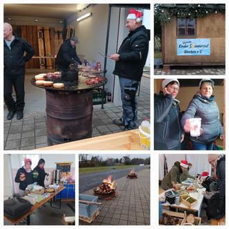 14 Uhr ging es dann los. Auch wenn der Wettergott an diesem Adventnachmittag nicht mit uns war, so konnten wir doch viele kleine und große Besucher begrüßen. Beim Weihnachtsbasteln wurden noch kleine Geschenke bzw. Gestecke hergestellt. Reik hatte dazu wieder gute Ideen für die Gäste. Bei dem kalten Wetter war der wärmende Kaffee passend und Rosinenstollen, selbst hergestellte gebrannte Mandeln und Schoko-Äpfel sehr lecker. Gegen 15 Uhr fanden sich die Kinder bei der „Leseoma“ ein und lauschten den Geschichten. Auch der Weihnachtsmann kam mit Engel und Wichtel, um kleine Geschenke an die Kinder und auch Erwachsene zu verteilen. Dafür wurde dem Weihnachtsmann Gedichte aufgesagt oder ein Lied vorgesungen. An Feuerschalen konnten sich unsere Gäste etwas aufwärmen und die Burger, Steaks und Roster schmeckten unseren Besuchern wiederum sehr gut. Für die Kleinen waren Wiener im Angebot. Zum Adventsnachmittag gehörte natürlich auch Glühwein, Kinderpunsch und verschiedene Getränke. Die Burger waren wieder das spezielle Angebot und schmeckten mit den Burgerbrötchen von der Bäckerei Töpfer sehr lecker, so dass sich der eine oder andere auch die Burger mit nach Hause nahm. Im Großen und Ganzen war es trotz des schlechten Wetters ein erster erfolgreicher Adventnachmittag.