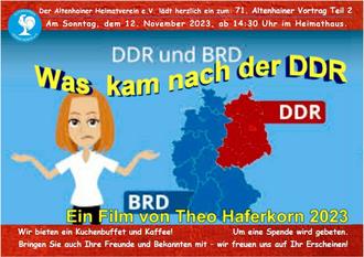 Der Altenhainer Heimatverein e. V. lädt herzlich ein zum 71. Altenhainer Vortrag - Teil 2 am Sonntag, dem 12. November 2023, ab 14:30 Uhr im Heimathaus. Heute präsentiert Theo Haferkorn “Was kam nach der DDR“. Nachdem im ersten Teil recht eindrucksvoll vierzig Jahre ostdeutsche Geschichte betrachtet wurden, hat Theo Haferkorn diesmal Erstaunliches und (fast) schon Vergessenes zusammengetragen über den Teil Deutschlands, was einst die DDR war und sich nun in der BRD seinen Platz finden muss, wie: Ereignisse um Währungsunion, verstorbene Persönlichkeiten, Ausschreitungen, Hochwasser, Wahlen, Unglücke und auch Schönes, uvm. … Wir bieten ein Kuchenbuffet und Kaffee! Um eine Spende wird gebeten. Bringen Sie auch Ihre Freunde und Bekannten mit – wir freuen uns auf Ihr Erscheinen!
