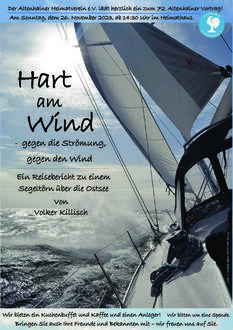 Der Altenhainer Heimatverein e. V. lädt herzlich ein zum 72. Altenhainer Vortrag, am Sonntag, dem 26. November 2023, ab 14:30 Uhr im Heimathaus: Hart am Wind - gegen die Strömung, gegen den Wind. Ein Reisebericht zu einem Segeltörn über die Ostsee von Volker Killisch. Wie eine „Landratte“ sich einen Traum erfüllt und zusammen mit der Crew so manche unerwartete „Klippe“ umschiffen muss, etwas Segellatein erlernt, aber auch die Schönheit der Natur erlebt. Wir bieten ein Kuchenbuffet und Kaffee sowie einen Anleger! Um eine Spende wird gebeten. Bringen Sie auch Ihre Freunde und Bekannten mit – wir freuen uns auf Ihr Erscheinen!