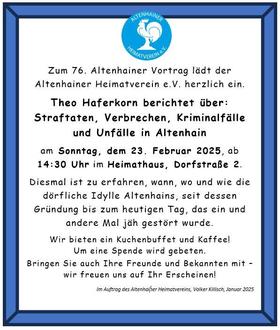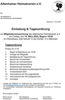 Am Freitag, den 14. März 2025 laden wir um 18:00 zur jährlichen Mitgliederversammlung in das Heimathaus „Alte Schule“ in Altenhain ein. Neben den regulären Tagesordnungspunkten freuen wir uns auf gemeinsamen Austausch rundum bisherige und mögliche zukünftige Aktivitäten unseres Vereins. Da, zu unseren praktischen und finanziellen Unterstützern, auch zahlreiche Nichtmitglieder gehören, weisen wir hiermit ausdrücklich darauf hin, dass auch Nichtmitglieder herzlichst willkommen sind sich am Austausch während der Mitgliederversammlung zu beteiligen (es besteht lediglich kein Stimmrecht). Insbesondere der Tagesordnungspunkt „Vorstandswahl 2027“ erfordert zahlreiche Teilnehmer. Wir möchten Sie über unser Vorgehen informieren, wie wir gedenken frühzeitig einen Vorstandswechsel vorzubereiten, um die ordnungsgemäße Geschäftsführung unseres Vereins auch zukünftig zu sicherzustellen.
